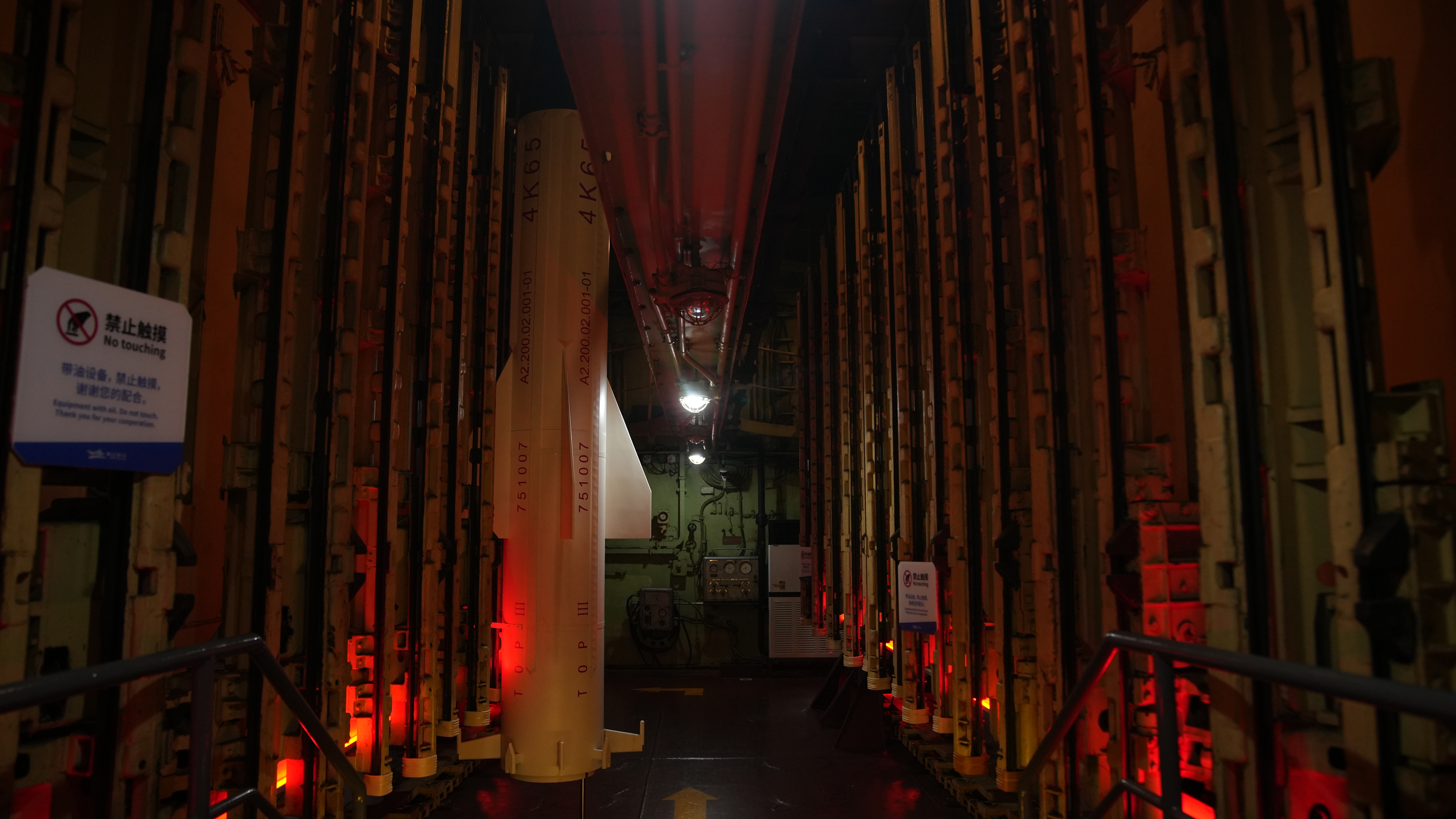 垂直貫穿于二甲、三甲,存放對空導彈。導彈置于可旋轉(zhuǎn)彈架,庫內(nèi)自動裝彈機能自動向發(fā)射架裝填導彈,每3秒就可完成2枚導彈的裝填。