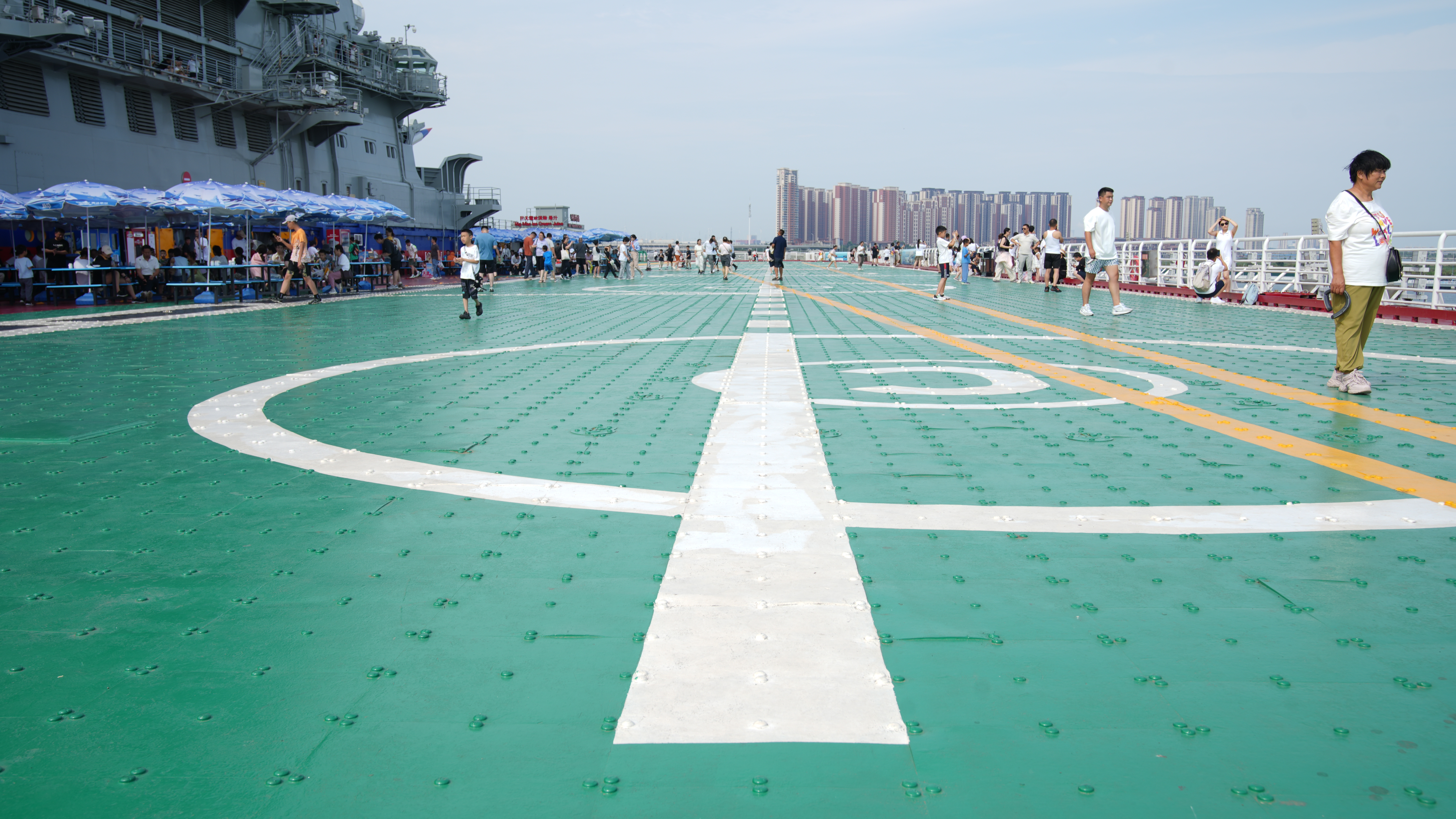 航母機(jī)庫是存放、保養(yǎng)和維修飛機(jī)的地方,航母的核心價(jià)值,在于它是海上的移動(dòng)機(jī)場(chǎng)!沒有它,飛機(jī)無法在茫茫大海上起降、補(bǔ)給,無法參與海戰(zhàn)。飛行甲板繪有白色圓圈,內(nèi)有地錨起到固定飛機(jī)的作用。